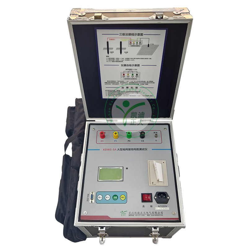 KDWS-5A型大型地網接地電阻測試儀,可測變電站地網(4Ω)、水火電廠、微波站(10Ω)、避雷針(10Ω)多用機型,采用了新型變頻交流電源,并采用了微機處理控制和信號處理等措施,很好的解決了測試過程中的抗干擾問題,簡化了試驗操作過程,提高了測試結果的精度和準確性,大大降低了試驗人員的勞動強度和試驗成本。