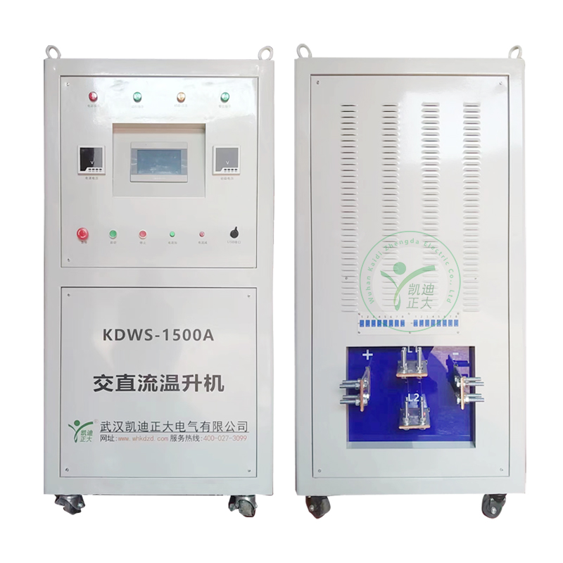 KDWS-1500A交直流溫升機,采用專用系統控制板進行控制,維綸系列觸控屏作為人機界面,實現的全自動交直流大電流檢測設備。該系列設備通過安裝不同模塊,可實現不同的大電流輸出,溫度測量等實驗。通過人機界面選擇可實現手動自動操作,查看溫度數據等操作并對數據進行簡單處理。可增加數據導出功能,通過U盤將數據導出到計算機,做進一步處理。