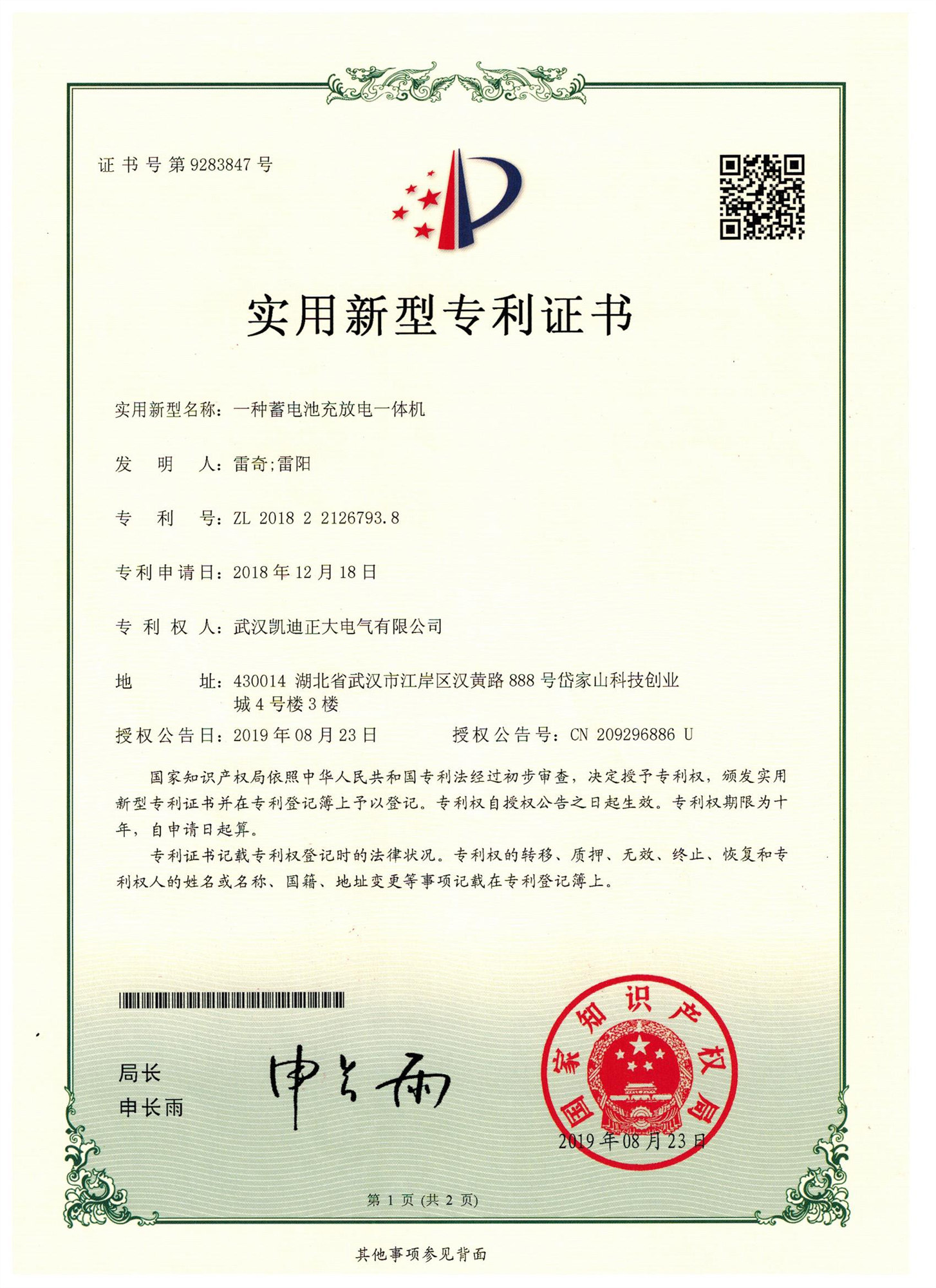 ![]() “KDZD886蓄電池充放電一體機”曾獲實用新型專利證書 |