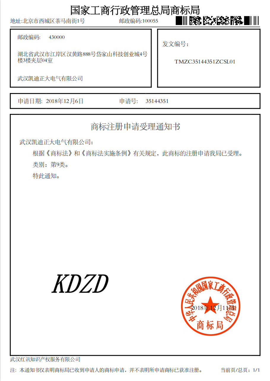 ![]() “KDZD”國家工商行政總局商標局受理書 |