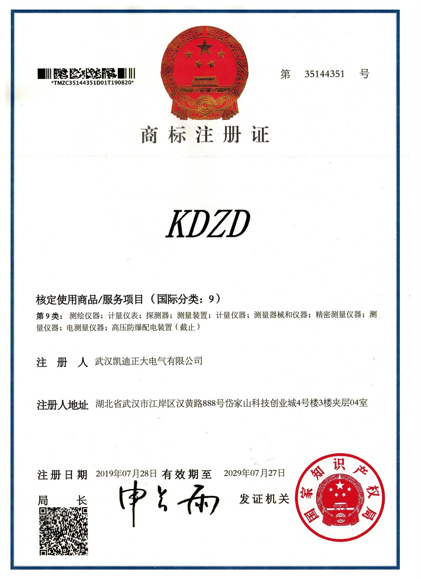 ![]() “KDZD”儀器類商標注冊證 |