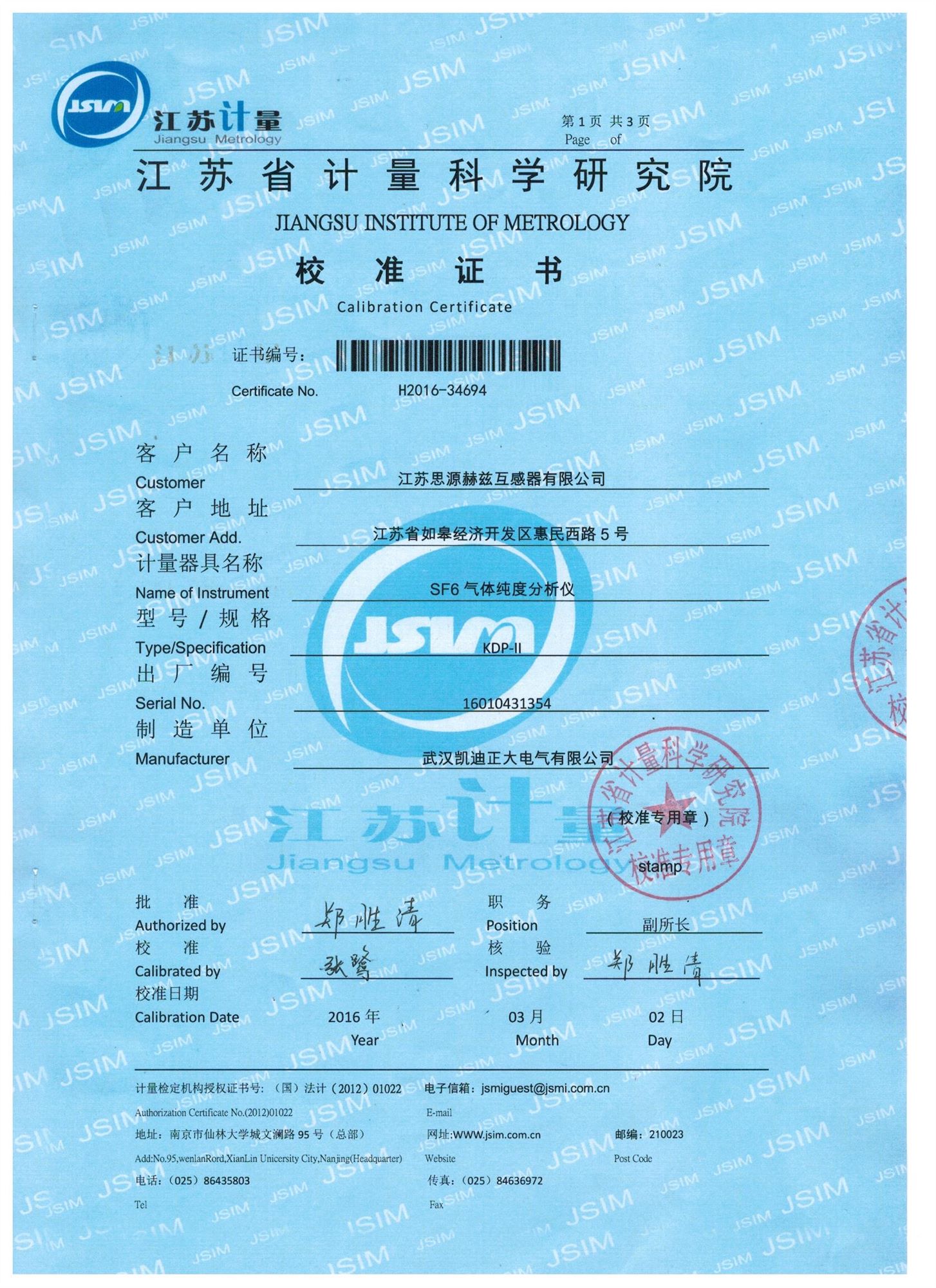 ![]() 江蘇省計量科學研究院-SF純度分析儀校準證書 |