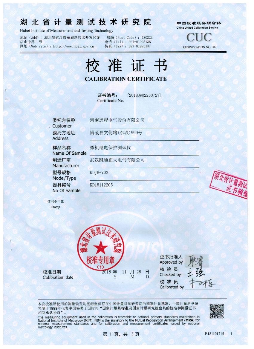 KDJB微機(jī)繼電保護(hù)測試儀取得研究院專業(yè)校準(zhǔn)證書