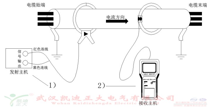 1)發(fā)射主機準備:將卡鉗卡入電纜,接線柱按顏色接入發(fā)射主機,開關置于“帶電識別”檔位,“輸出指示”閃亮則輸出正常;