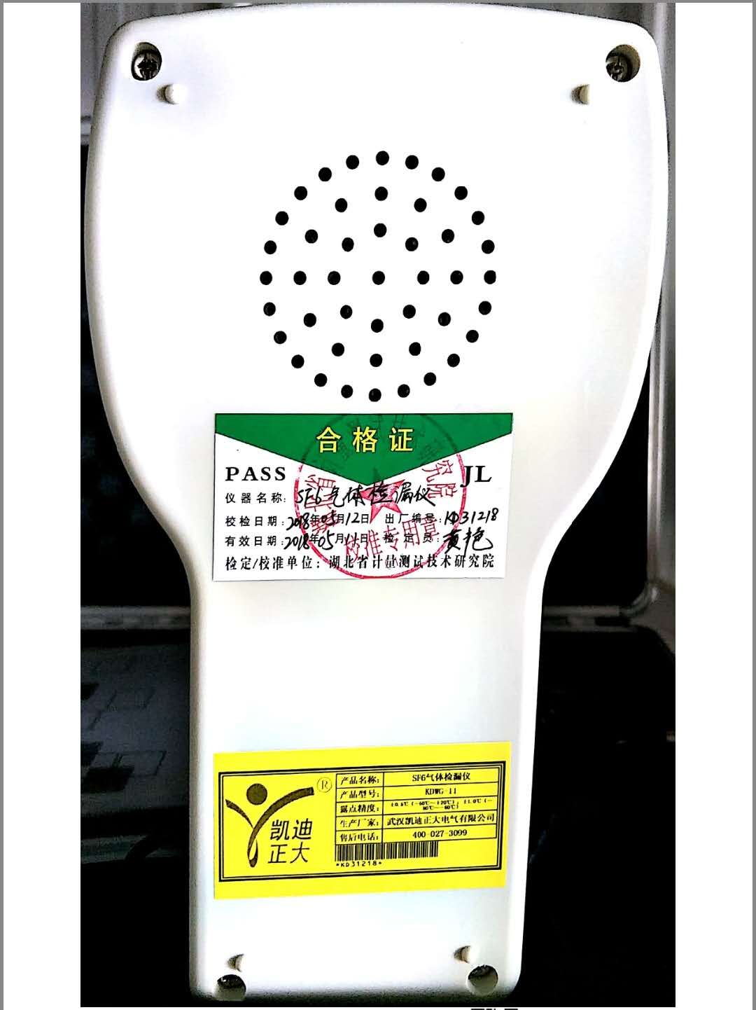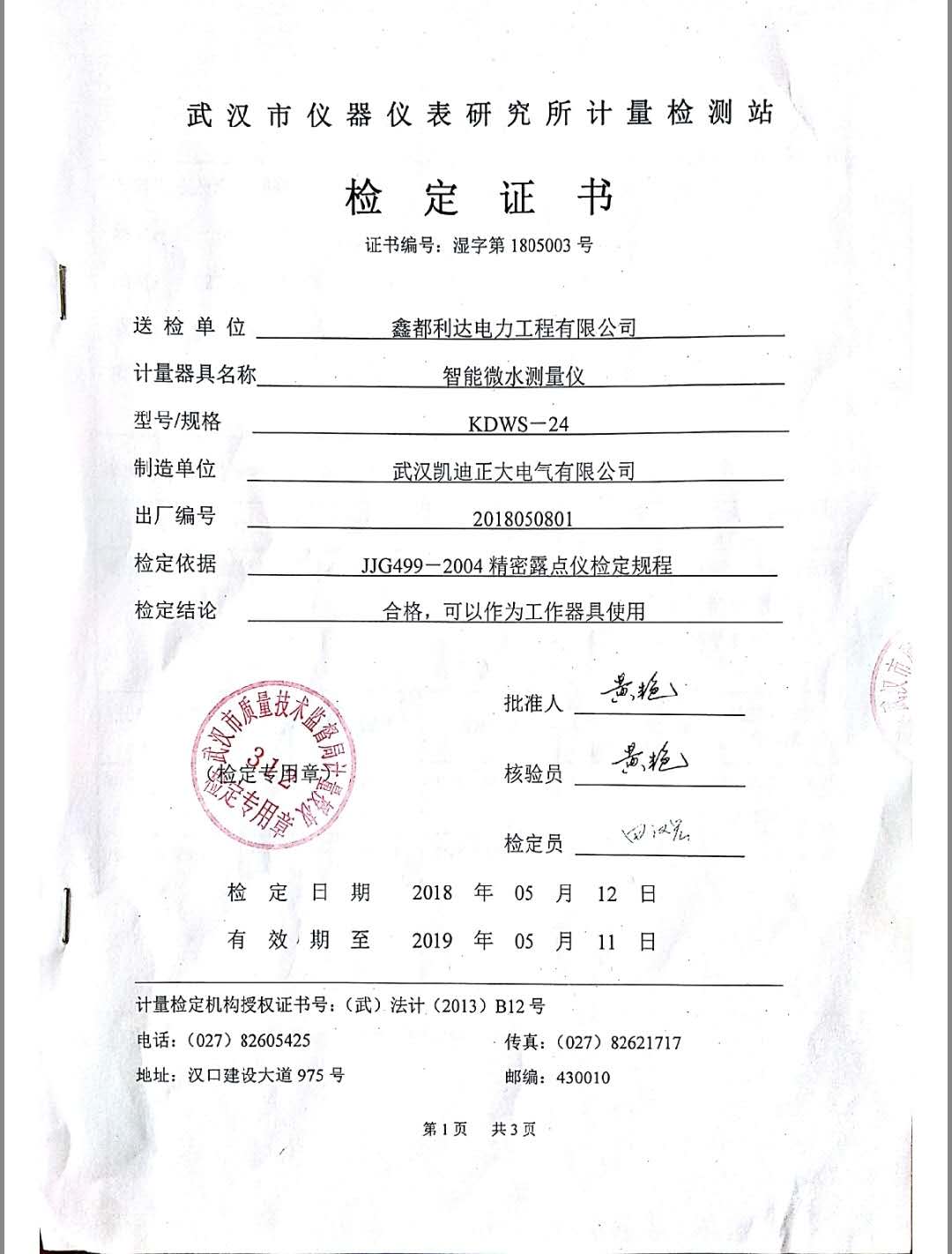 武漢市儀器儀表研究所計量檢測站,計量檢定機構授權證書:(武)法計(2013)B12號。武漢凱迪正大電氣有限公司生產的KDWS-24智能微水測量儀,出廠編號2018050801,符合檢定依據JJG499-2004精密露點儀檢定規程,可以作為工作器具使用。獲得武漢市儀表研究院計量站檢定證書,證書編號:濕字第1805003號。