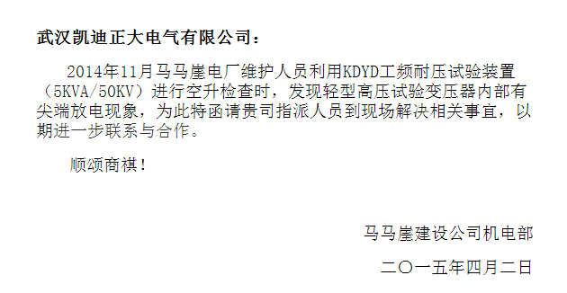 貴州黔源電力股份有限公司馬馬崖一級(jí)水電站項(xiàng)目建設(shè)以來(lái),電氣設(shè)備運(yùn)行前預(yù)試設(shè)備均使用武漢凱迪正大電氣有限公司提供。2015年4月2日,黔源電力馬馬崖水電站建設(shè)公司機(jī)電部致電我司,邀請(qǐng)我司技術(shù)前往指導(dǎo)KDYDJ工頻耐壓試驗(yàn)裝置升壓試驗(yàn),此次采購(gòu)的設(shè)備有KDYD工頻耐壓試驗(yàn)操作箱、YDJ-5KVA50KV油浸式試驗(yàn)變壓器。凱迪正大公司售后部人員隨時(shí)準(zhǔn)備等待馬馬崖水電站的通知前往。