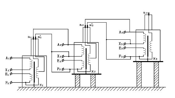 為了得到更高電壓的試驗變壓器,也可采用串級的方法獲得更高的電壓。圖二為三級串試驗變壓器的原理接線圖。其中三臺變壓器的容量和電壓關(guān)系滿足:P1=2P2=3P3,U(總)=U1+U2+U3S,
