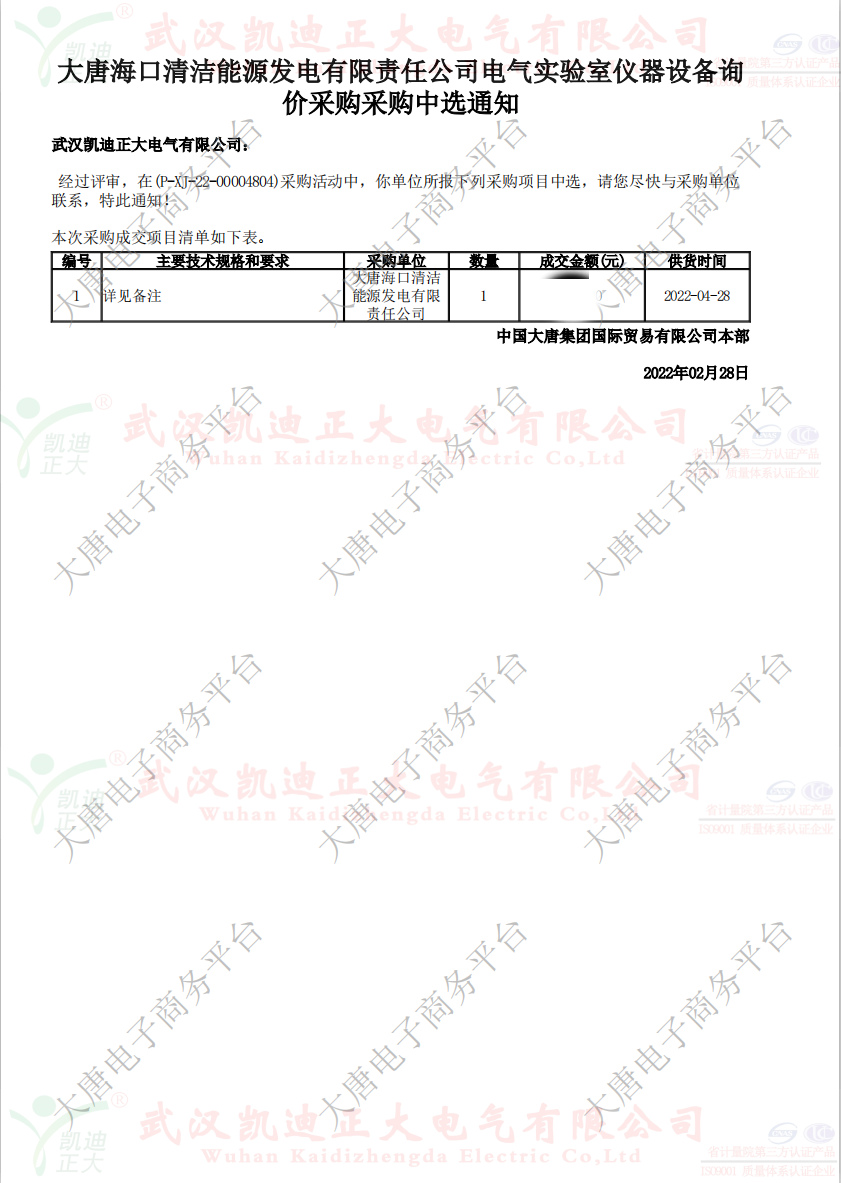 遲日江山麗,春風(fēng)花草香。祝賀我司商務(wù)部再次接到中國大唐??谇鍧嵞茉窗l(fā)電有限責(zé)任公司電氣實驗室儀器設(shè)備詢價采購采購中選通知。