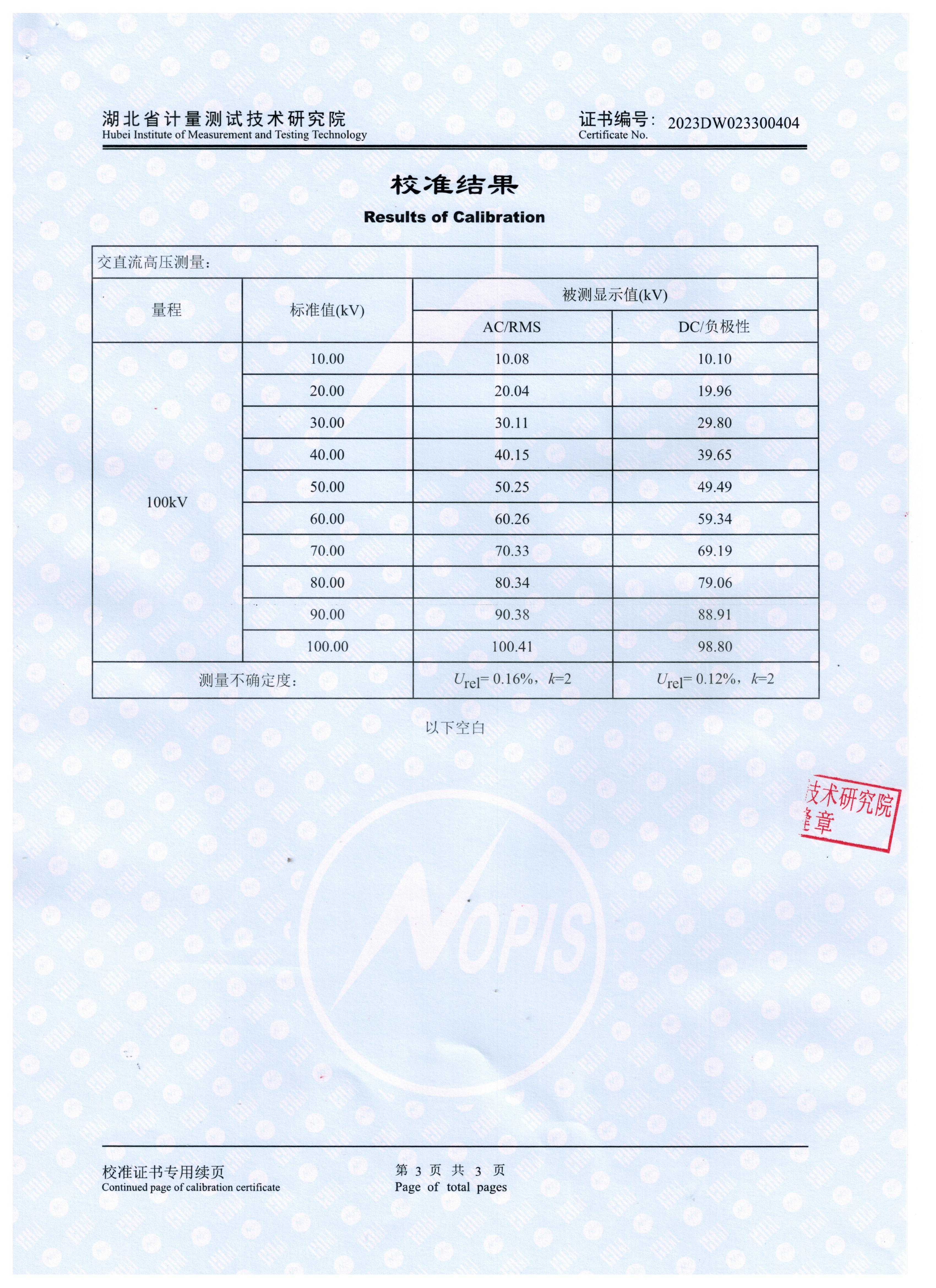 參照 JJG 496-2016 《工頻高壓分壓器》、JJG 1007-2005《直流高壓分壓器鑒定規(guī)程》 檢定要求,KDFCR-100 交直流兩用分壓器獲得證書2023DW023300404檢定證書。