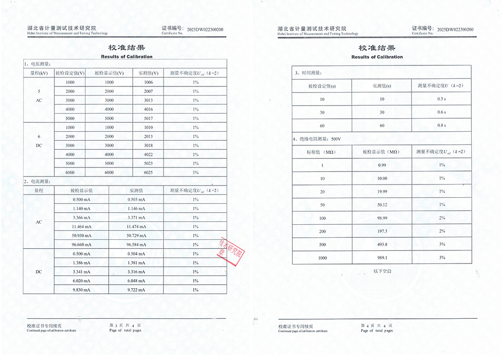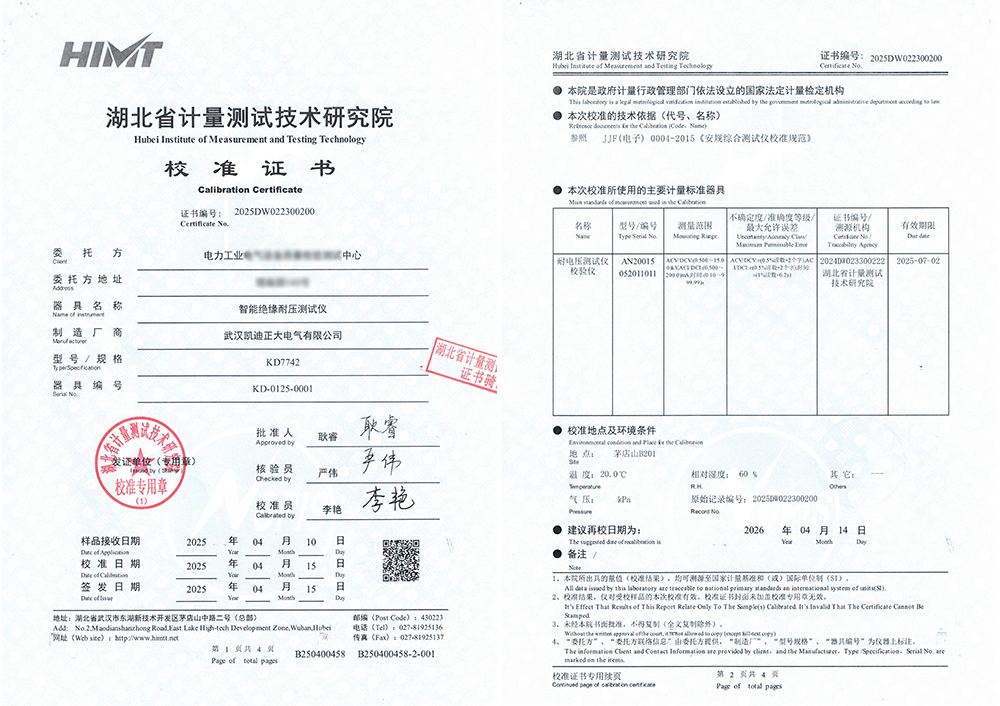 此次校準過程對KD7742智能絕緣耐壓測試儀來說是一次嚴苛的考驗。湖北省計量測試技術研究院作為計量校準機構,以其專業(yè)的技術水平和嚴謹的校準流程著稱。校準過程中,研究院對KD7742的各項性能指標進行了全面、細致的測試和評估,包括其交/直流耐壓測試、絕緣電阻測試等功能模塊的準確性和穩(wěn)定性。經過一系列嚴格的測試,KD7742智能絕緣耐壓測試儀成功通過了校準,獲得了校準證書。這不僅證明了KD7742智能絕緣耐壓測試儀在設計和制造上的品質,也體現了武漢凱迪正大電氣有限公司對產品質量的嚴格把控和持續(xù)追求。