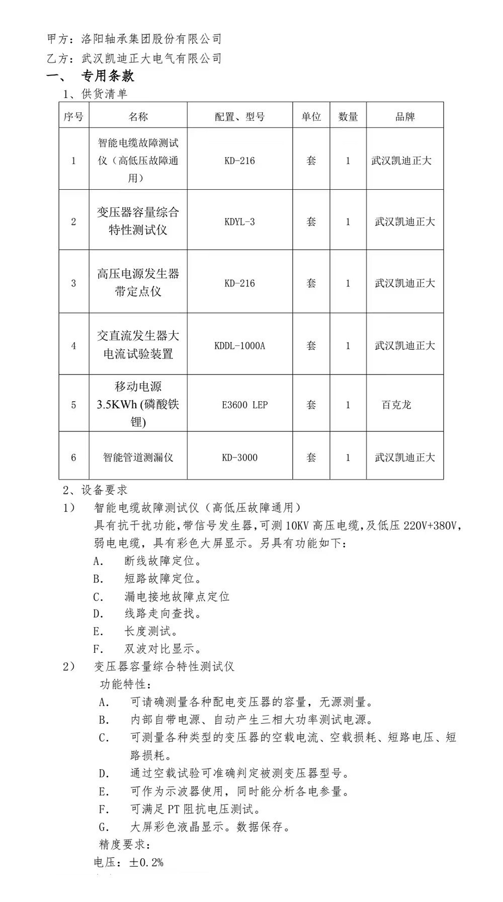 近日,洛陽軸承集團股份有限公司選擇與武漢凱迪正大電氣有限公司合作,批量采購了一系列電氣測試設備。此次采購的設備涵蓋了KD-216智能電纜故障測試儀、KDYL-3變壓器容量綜合特性測試儀、KD-216高壓電源發生器、KDDL-1000A交直流大電流試驗裝置以及KD-3000智能管道測漏儀。