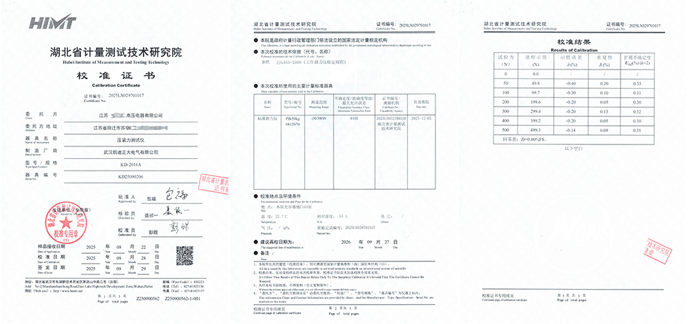 為確保測量數據的準確性和可靠性,客戶要求將采購的KD-2016A壓緊力測試儀送至湖北省計量測試技術研究院進行校準。校準證書編號為2025LX029701017,由該院權威出具,確保了設備的量值溯源至國家計量基準和國際單位制(SI)。