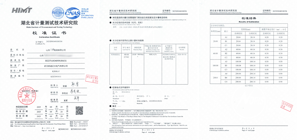 校準方法: 使用院內計量標準器具——MS-III型時間校驗儀(證書編號:2025DW035400342)作為標準時間源,輸出一系列精確的標準時間信號(20.00ms, 60.00ms, 100.00ms, 200.0ms)模擬開關的合閘與分閘時間。
