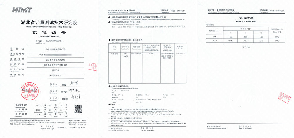 近日,山東某檢測有限公司引進了由武漢凱迪正大電氣有限公司生產的KDGK-F高壓開關機械特性測試儀與KDYZ-K變壓器有載開關測試儀,并委托湖北省計量測試技術研究院對兩款儀器進行了全面校準,均取得校準證書。